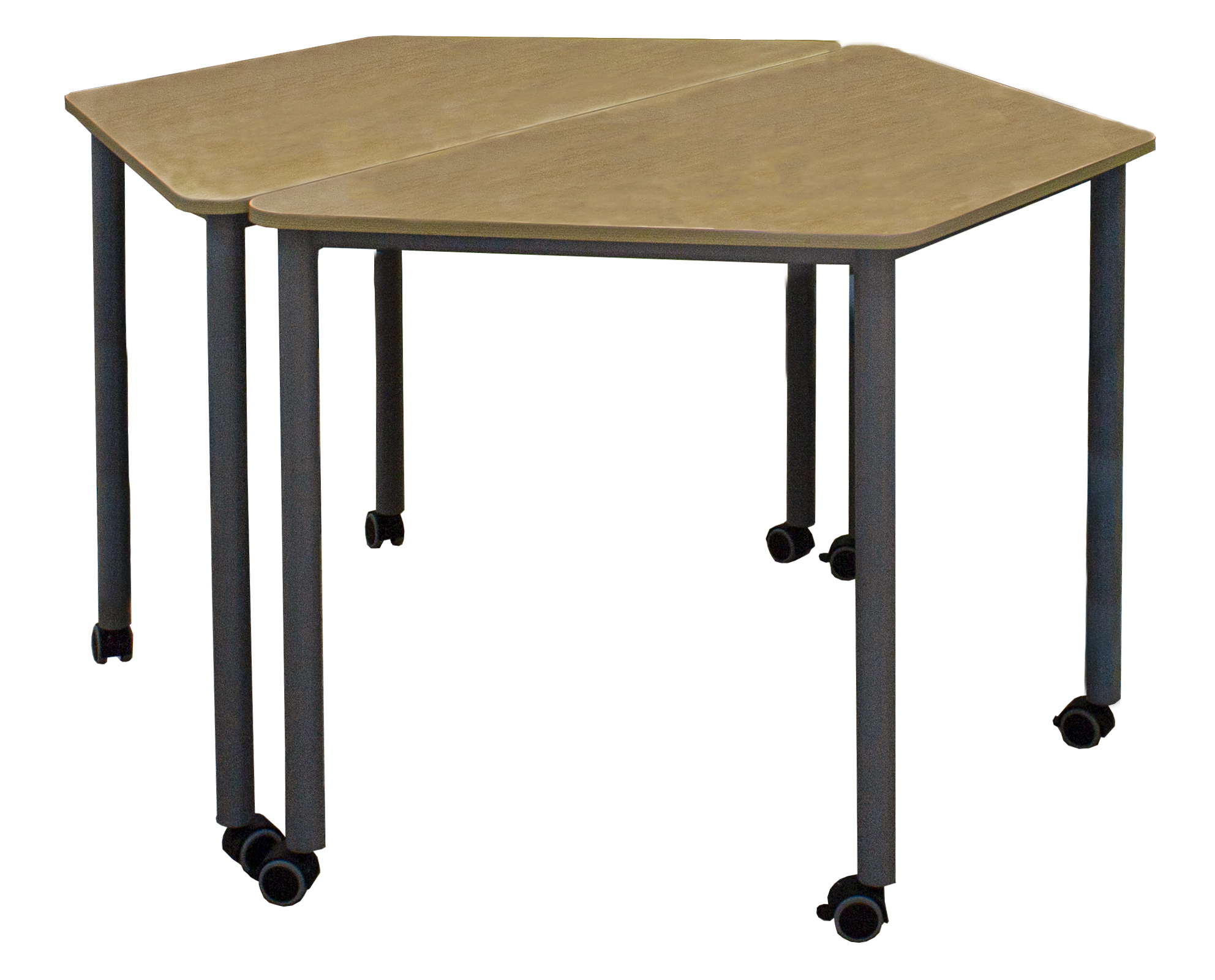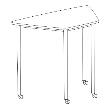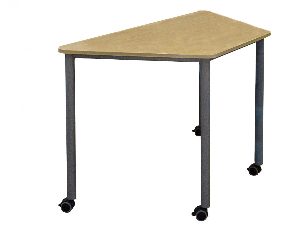 Габаритные размеры 1200х600х750 мм. Столешница в форме трапеции, изготовлена из ЛДСП 16 мм, облицована кромкой ПВХ 2 мм. Столешница крепятся к каркасу стола шурупами. Каркас металлический, сварной, из стальных профильных труб. Каркас окрашен порошковой краской. Стол комплектуется колесами, два из которых со стопором.